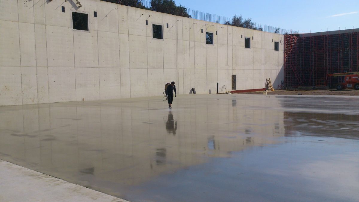Lorsque le radier est fini, un produit de séchage est pulvérisé dessus. Ce dernier forme un film sur le béton et évite à la surface du radier de sécher trop vite.